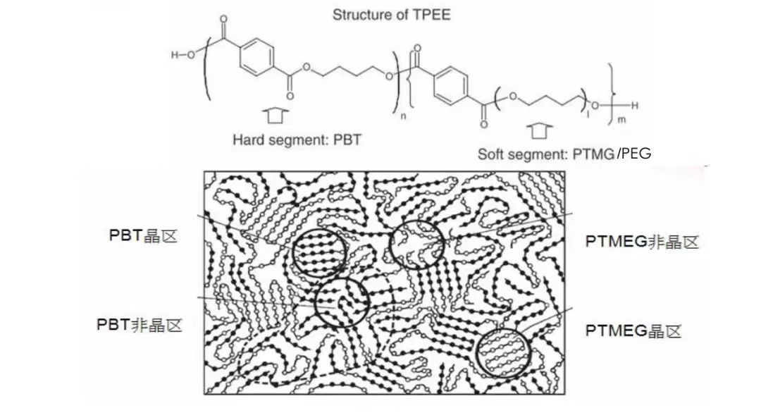 微相分离结构:TPEE的硬段和软段通过微相分离形成物理交联点,当温度低于硬段熔点时,结晶微区起到物理交联点的作用,防止软段在外力作用下发生永久形变,从而保证材料具有高弹性;当温度高于硬段熔点时,结晶微区熔融流动,使材料易于加工成型。