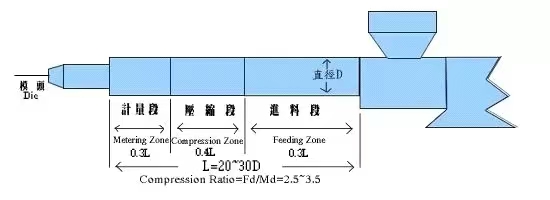 螺杆设计:L/D介于20~30,压缩比2.5~3.5,螺杆转速30~50rpm。
